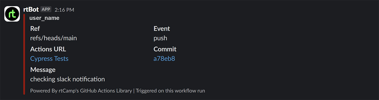 secret you set earlier to send Slack notifications to your target channel in case of any failures in your workflow. - Verify that all failed workflows trigger a Slack notification with a link to the GitHub Actions log.