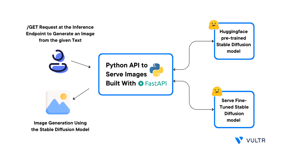 This guide describes how you can build an Inference API using Hugging Face Diffusers and FastAPI on a Vultr NVIDIA A100 Cloud GPU server. You are to execute each of the building steps and have a functional inference API that utilizes the pre-trained Stable Diffusion 2.1 model. This process involves leveraging the capabilities of FastAPI for efficient implementation.
