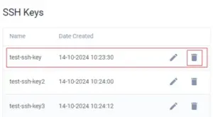2.Select the SSH key from the list and click the Delete SSH Key icon.