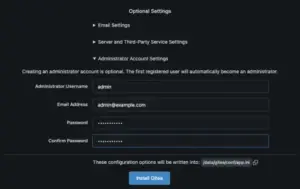 2.Scroll down to the Optional Settings section, and expand the Administrator Account Settings. Fill in the values to create an Administrator user.
