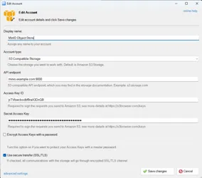 minio.example.com:9000. - Encryption password: Optionally, enter a password to encrypt the saved configuration.