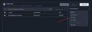 8.Verify that your upload is complete and the new file is available in your bucket. To share the file, click it and select Share to generate an encrypted URL of downloading the file.