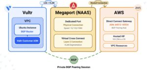 In this guide, you will create a private, low-latency connection between Vultr and AWS using Direct Connect hosted through Megaport. You will provision a dedicated port, order a Virtual Cross Connect (VXC) using Megaport, configure the connection on both Vultr and AWS, and verify the setup by testing BGP route advertisements and end-to-end connectivity between your Vultr and AWS resources.
