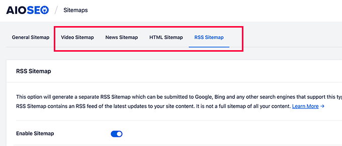 All in One SEO also allows you to create video, news, RSS sitemap, and HTML sitemap for your website.