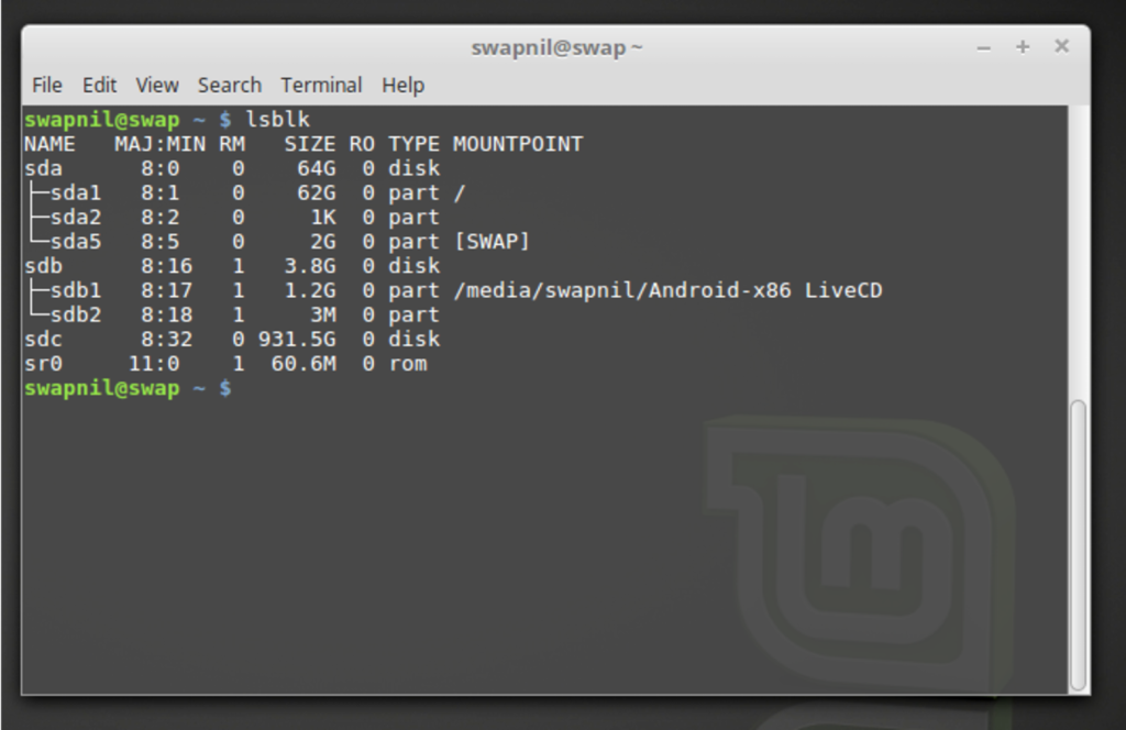 Using ‘lsblk’ is the simplest and easiest way to find all block devices connected to your system. As you can see, the lsblk command is showing me my SSD ‘sda’ where Linux Mint 18.1 is installed, ‘sdb’ is a USB Flash Drive, and ‘sdc’ is 1TB internal hard drive.