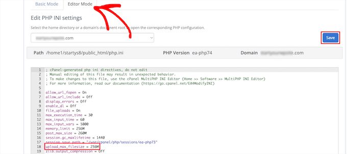 Alternatively, you can click the ‘Editor Mode’ menu tab, and then you can change the maximum file upload size directly in the editor.