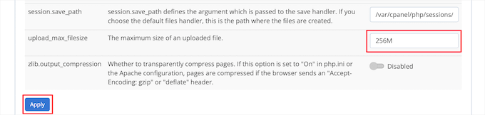 Next, scroll down to the section labeled ‘upload_max_filesize’ and enter a new maximum filesize into the box.
