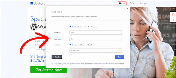Simply head over to your hosting provider website, like Bluehost, and click the ‘Chat’ tab.