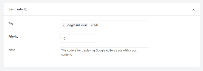To help organize your ads, you can go to the ‘Basic info’ section. In this area, you can add tags and notes to help you remember what your ad code snippet is for.