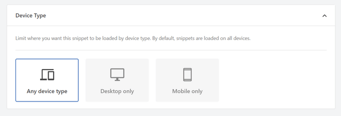 Next, you can scroll down to the ‘Device Type’ section. Here, you can choose whether you want to display your ad on any device type, desktop only, or mobile only.