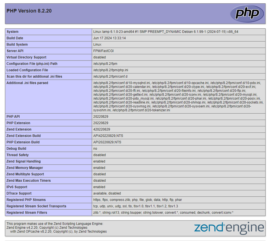 PHP 8.2.20 (cli) (built: Jun 17 2024 13:33:14) (NTS) Copyright (c) The PHP Group Zend Engine v4.2.20, Copyright (c) Zend Technologies with Zend OPcache v8.2.20, Copyright (c), by Zend Technologies