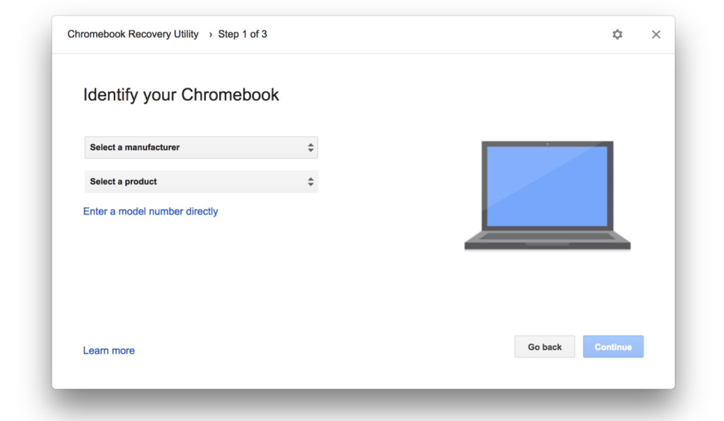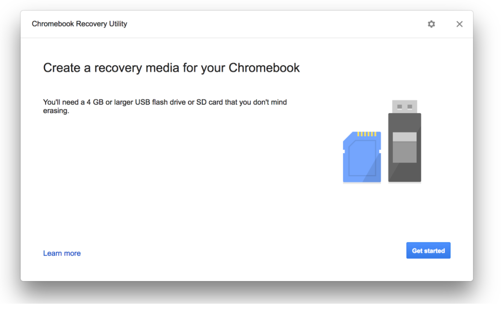 Install Chromebook recovery utility from the Chrome web store. Open the app and follow the instructions to create the recovery drive. It’s an easy three-step, click next process. All you need is working Internet and a USB drive with at least 4GB space.