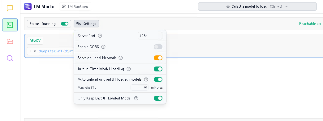 to automatically unload inactive models. - Change the server status from Stopped to Running to start the LM Studio API server.