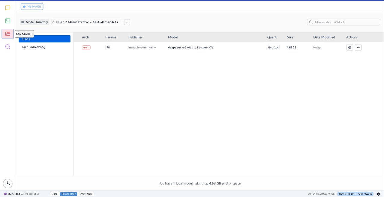 - Click LLMs or Text Embedding to view the models locally available in LM Studio.