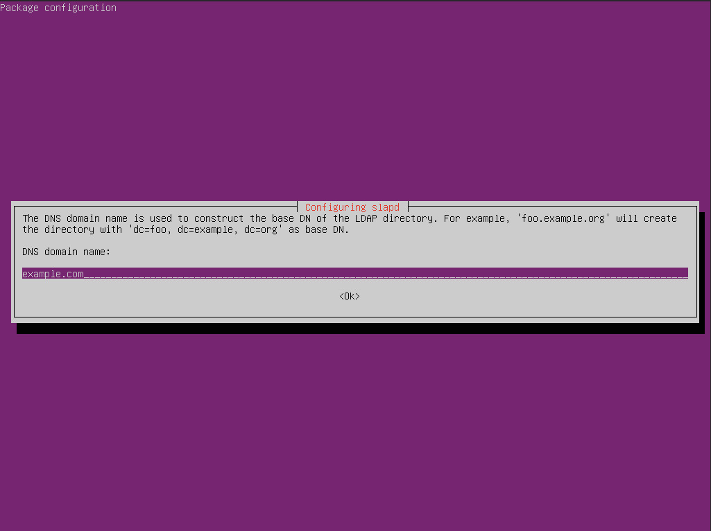 In the first window, hit Enter to select No and continue on. In the second window of the configuration tool (Figure 2), you must type the DNS domain name for your server. This will serve as the base DN (the point from where a server will search for users) for your LDAP directory. In my example, I’ve used example.com (you’ll want to change this to fit your needs).