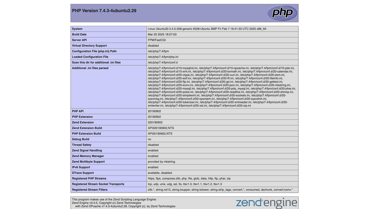 PHP 7.4.3-4ubuntu2.29 (fpm-fcgi) (built: Mar 25 2025 18:57:03) Copyright (c) The PHP Group Zend Engine v3.4.0, Copyright (c) Zend Technologies with Zend OPcache v7.4.3-4ubuntu2.29, Copyright (c), by Zend Technologies