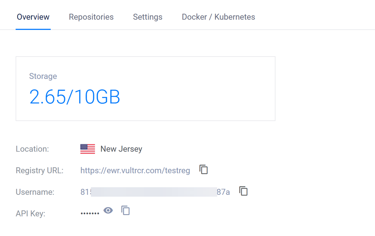 - Find your registry details within the overview tab, and copy the username and API key credentials to your clipboard.
