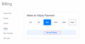 - Select Alipay, choose an amount, or click Other to enter a custom amount.
