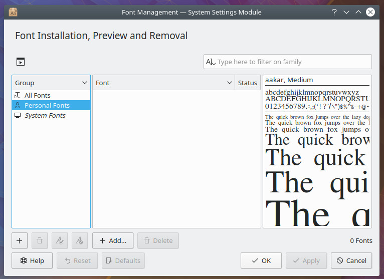 There are a few ways to manage your fonts in Linux, via GUI. How it’s done will depend on your desktop environment. Let’s examine KDE first. With the KDE that ships with Kubuntu 18.04, you’ll find a Font Management tool pre-installed. Open that tool and you can easily add, remove, enable, and disable fonts (as well as get information about all of the installed fonts. This tool also makes it easy for you to add and remove fonts for personal and system-wide use. Let’s say you want to add a particular font for personal usage. To do this, download your font and then open up the Font Management tool. In this tool (Figure 1), click on Personal Fonts and then click the + Add button.