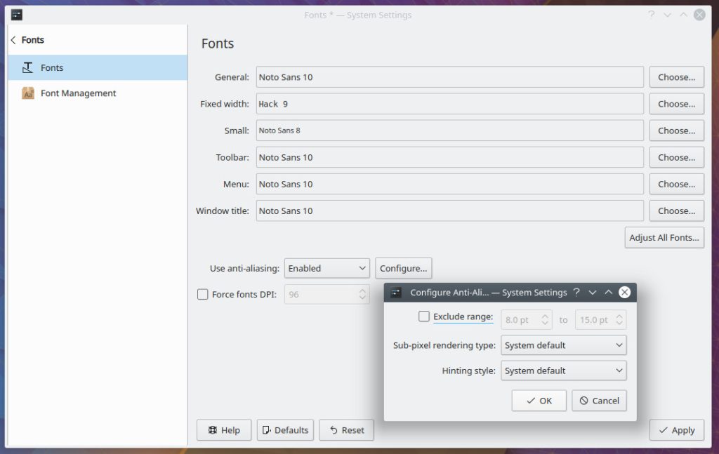 Open up the System Settings tool and clock on Fonts. In this section, you can not only change various fonts, you can also enable and configure both anti-aliasing and enable font scaling factor (Figure 4).