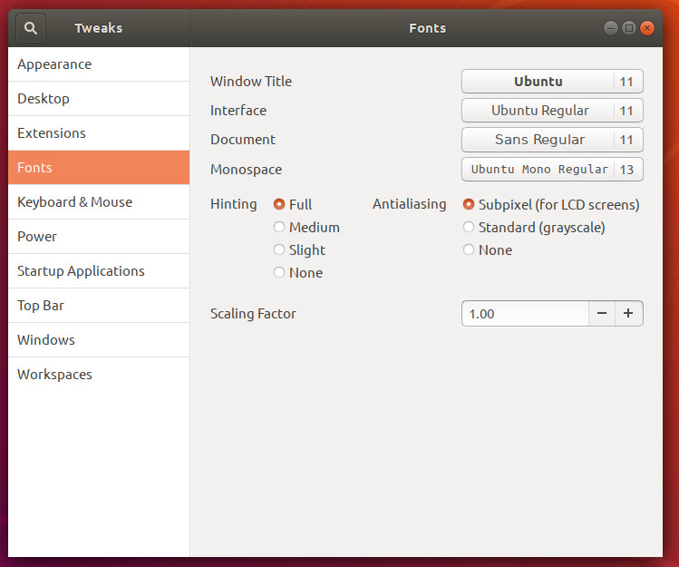 To do this in GNOME, you have to have either use Font Manager or GNOME Tweaks installed. For this, GNOME Tweaks is the better tool. If you open the GNOME Dash and cannot find Tweaks installed, open GNOME Software (or Ubuntu Software), and install GNOME Tweaks. Once installed, open it and click on the Fonts section. Here you can configure hinting, anti-aliasing, and scaling factor (Figure 6).