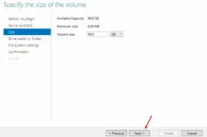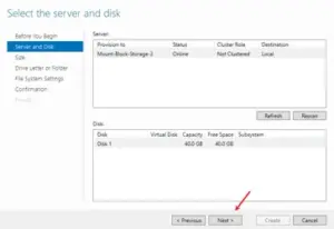 11.Select the target Windows Server, verify the Vultr Block Storage volume capacity, and click Next to set up the size.