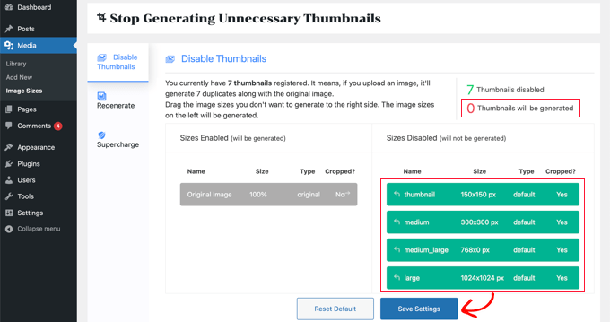 Make sure you click the ‘Save Settings’ button to activate your new settings. Now when you upload new images on your WordPress blog, no extra image sizes will be generated.