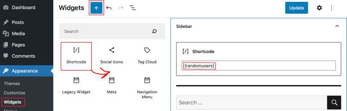 You’ll need to navigate to Appearance » Widgets and then click the ‘Plus’ Block Inserter icon. You need to find the Shortcode block and drag it onto your sidebar or other widget area.
