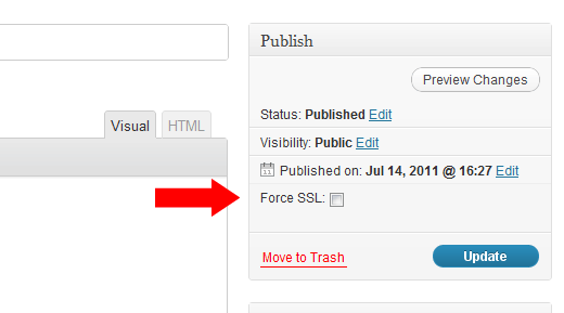 Now lets go to the Pages tab in the WordPress admin panel. Select the page you want to have SSL certificate on (most likely your checkout page, donate page etc). Click to edit that page. Right above the publish button, there is a new checkbox that says Force SSL.