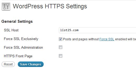 Once the SSL certificate is ready to use on your server, now we need to implement it in WordPress. The easiest way is to install and activate WordPress HTTPs plugin. After you activate it head on over to Settings » WordPress HTTPS menu. Enter the SSL host name which will be your domain name. Then check the box Force SSL Exclusively. This basically means that only few pages on the site will be HTTPS, the others will be redirected to HTTP (normal). You can choose to force SSL on administration if you want, but it is not required.