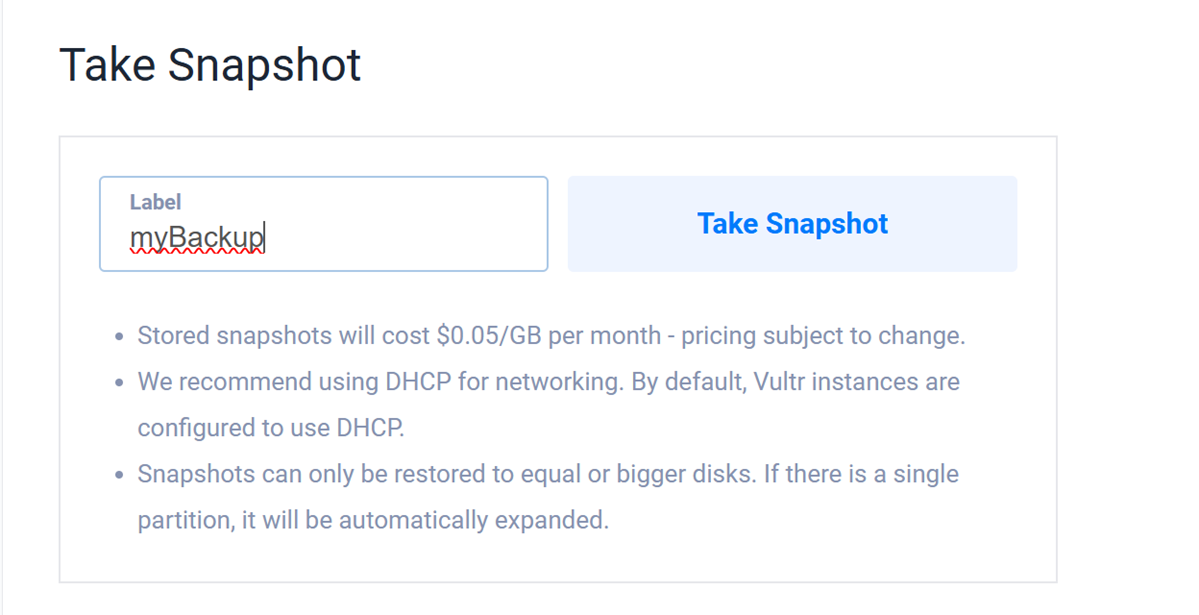 - Enter a new snapshot label in the Label field and click Take Snapshot.