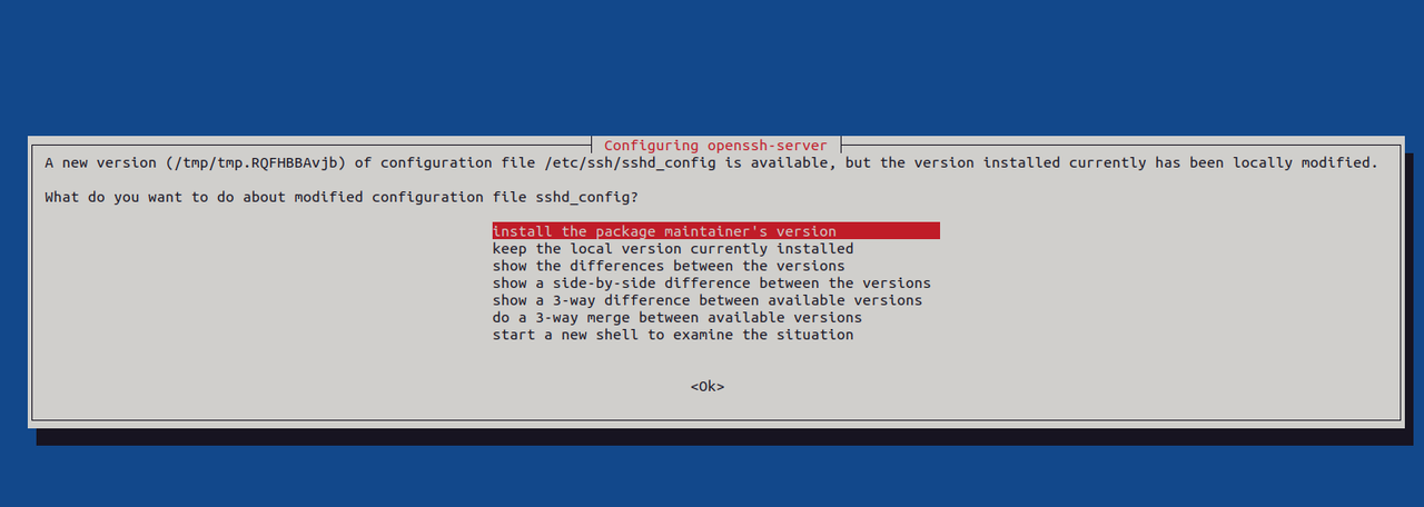 and press Enter to continue with the upgrade process. - What do you want to do about modified configuration file ssh_config?: Select