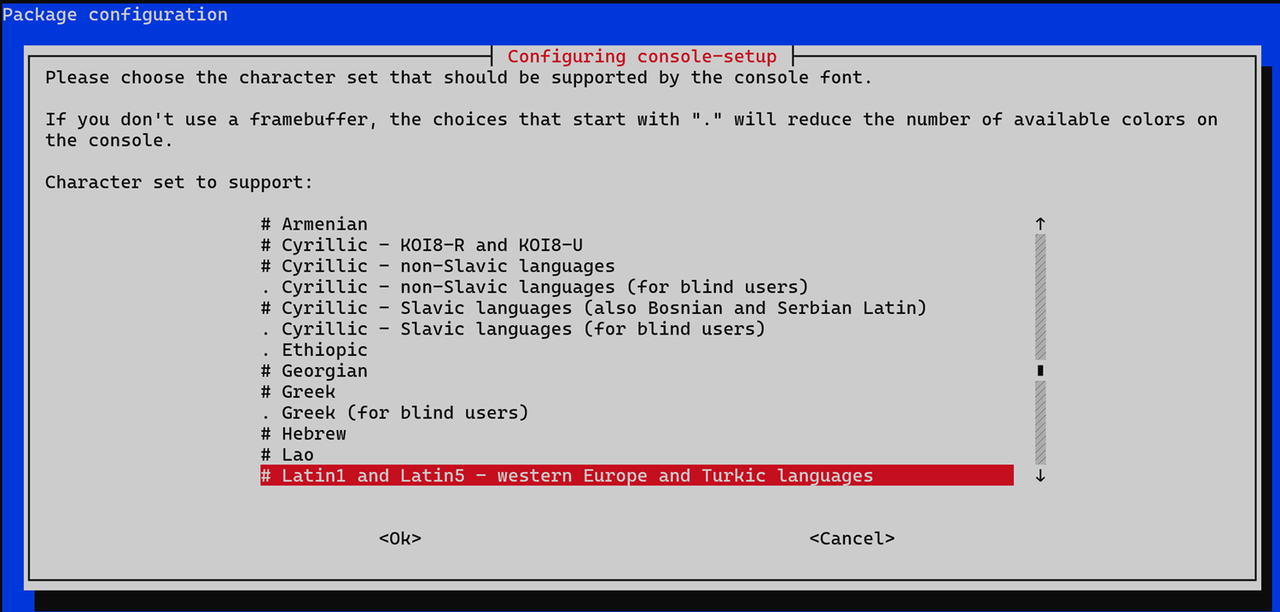 options and press Y to close the pager. When prompted, reply to each of the following prompts:- Character set to support: Press Enter to use the default keyboard layout.
