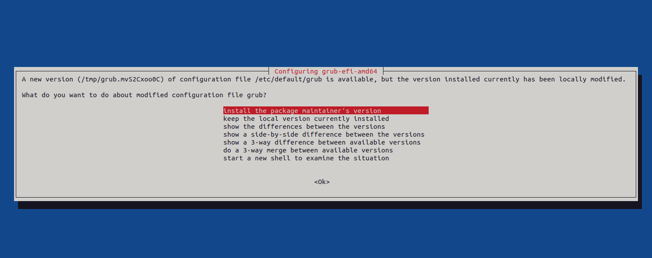 and press Tab to select OK and press Enter. - What do you want to do about modified configuration file grub?: Select
