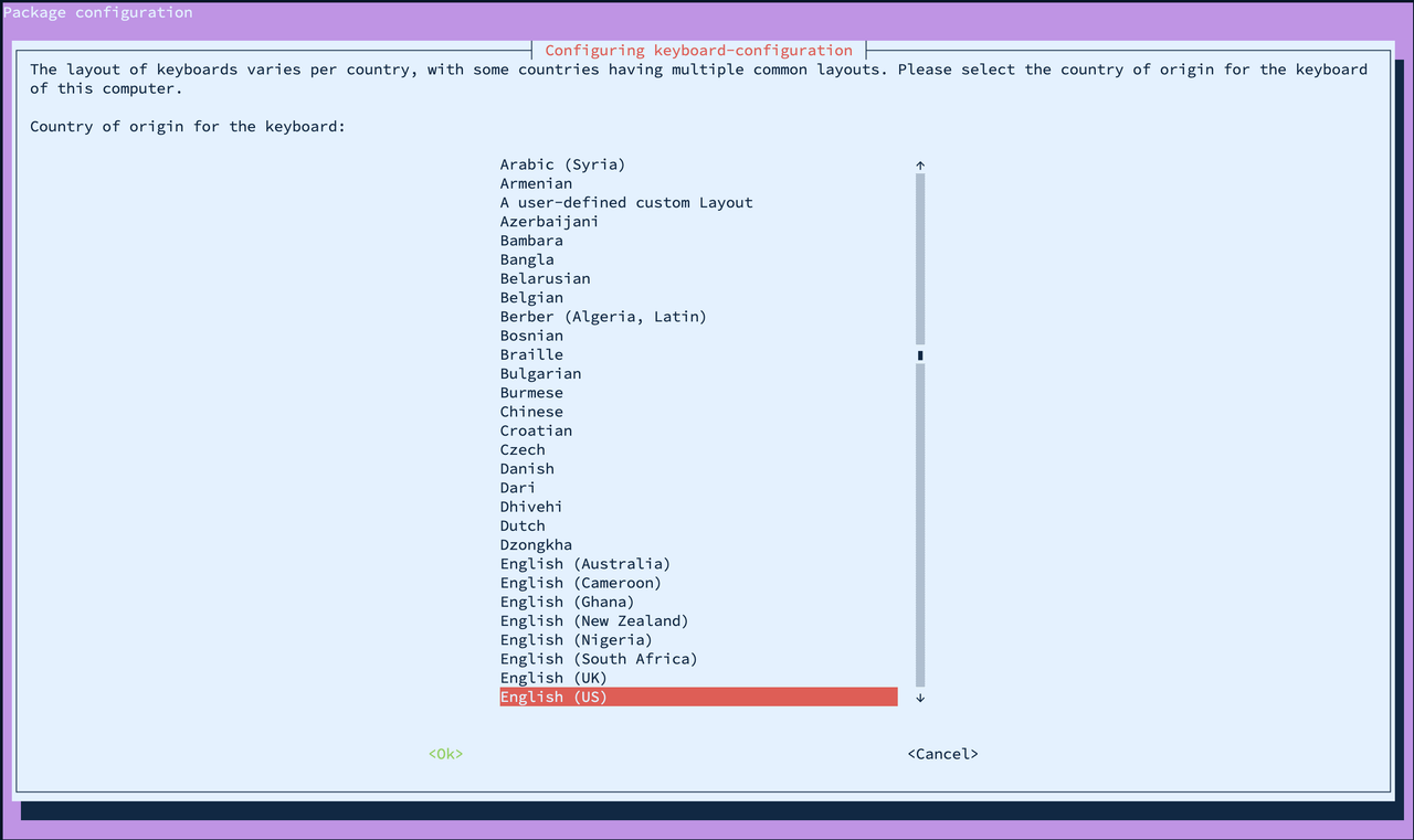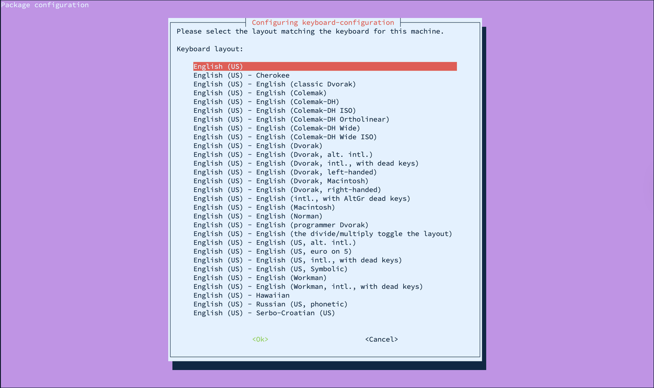 - Select the appropriate layout for your keyboard and press ENTER to proceed.
