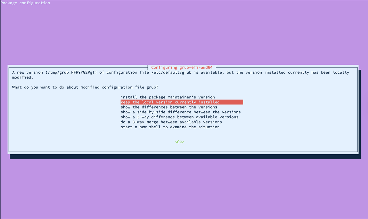 configuration when prompted.Configuration file '/etc/update-manager/release-upgrades' ==> Modified (by you or by a script) since installation. ==> Package distributor has shipped an updated version. What would you like to do about it ? Your options are: Y or I : install the package maintainer's version N or O : keep your currently-installed version D : show the differences between the versions Z : start a shell to examine the situation The default action is to keep your current version. *** release-upgrades (Y/I/N/O/D/Z) [default=N] ?