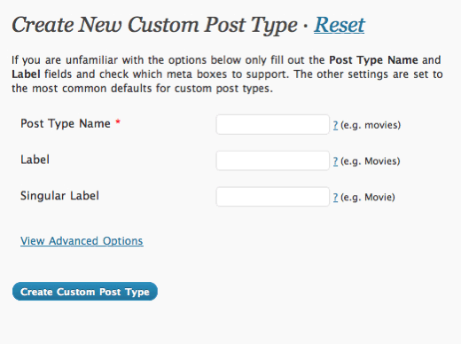 Next you are given a few options to fill in. The “Post Type Name” is what will be used by WordPress to query all the posts from such post_type. The “Label” is what will be displayed on the sidebar of your Dashboard, just like the regular “Post” menu is. If you expand the “View Advanced Options” you’ll see a few more options that you can configure. Most are self explanatory, such as “Public” and “Show UI”. The first one when set to true allows the custom post type menu to be displayed on the sidebar, and the other one (show ui) when set to true generates the menu panel.