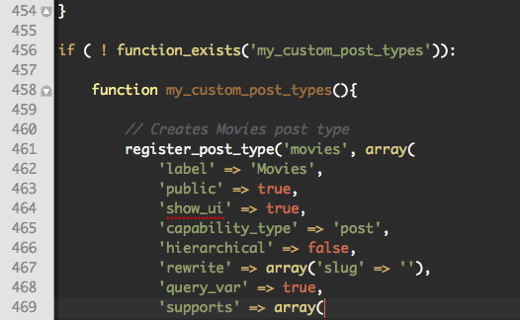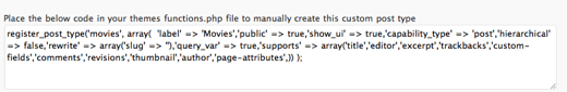 123456789101112131415161718192021 | // Creates Movies post type register_post_type( 'movies' , array ( 'label' => 'Movies' , 'public' => true, 'show_ui' => true, 'capability_type' => 'post' , 'hierarchical' => false, 'rewrite' => array ( 'slug' => 'movies' ), 'query_var' => true, 'supports' => array ( 'title' , 'editor' , 'excerpt' , 'trackbacks' , 'custom-fields' , 'comments' , 'revisions' , 'thumbnail' , 'author' , 'page-attributes' ,) ) ); |