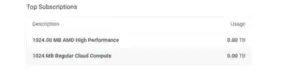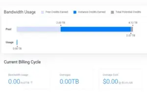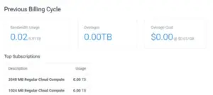 The Vultr Bandwidth Usage page provides an overview of the total data transferred between your cloud resources and the internet. It displays usage for your top Cloud Compute instance subscriptions across the current and previous billing cycles. You can also view any overage fees incurred for exceeding your plan’s bandwidth limits.