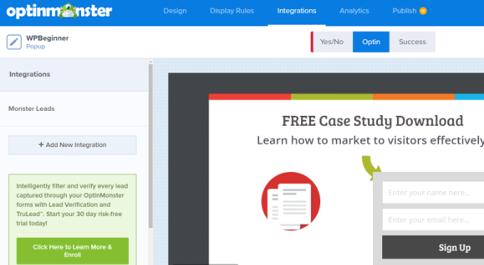 OptinMonster allows you to easily create and integrate highly effective optin forms on your website. It integrates with all major email service providers, and comes with powerful features such as drag and drop campaign builder, page-level targeting, A/B split testing, exit-intent technology, and more.