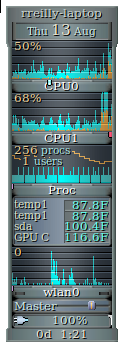 GKrellM is a small graphical application that shows cpu temperatures, memory usage, disk activities, network traffic, and a whole host of other information about your system. Information monitored and displayed, of course, depends on the particular type of sensors employed by your laptop. The newer machines tend to have more and a greater variety of built-in sensors.