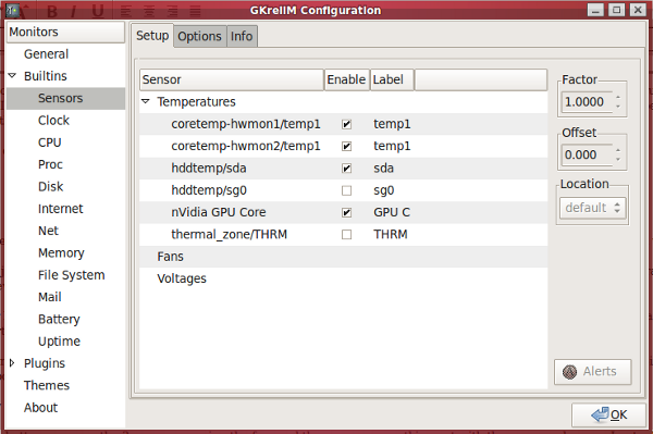 Different metrics and charts can be added and removed from the stack as needed. Right click on the top block of the stack to bring up a small menu where you can choose Configuration. You can also click F1 when GKrellM is displayed to go right to the menu. Figure 2 shows the configuration menu with particular focus on the cpu temperatures. Options are selected by way of check boxes. If the measurement shows up on the menu, GKrellM can track it, although there may be a slight delay before some of the metrics start. For example, it took three or four seconds, when I checked the hddtemp/sda box before it showed the correct temperature. Lack of an accurate reading gives 32 degrees, which clearly wouldn’t be correct. GKrellM defaults to Celsius readings, but you can change it to Fahrenheit under the Built-ins -> sensors -> options menus.