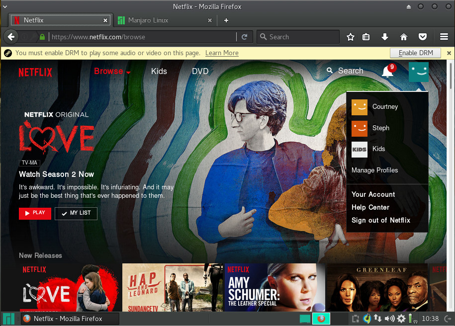 I was pleasantly surprised that Manjaro was able to play MP3s out of the box with one of its media players. The Xfce edition of Manjaro ships with both Guayadeque and Parole media players. Of the two, only Guayadeque was able to play MP3 files out of the box. YouTube videos play without issue and Netflix only requires the enabling of DRM (Figure 4) and the installation of the Random Agent Spoofer extension.