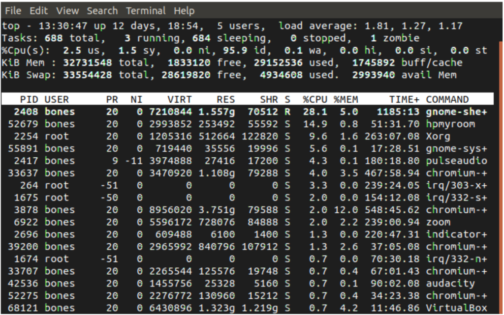 Most folks though want to get a list of processes because they would like to stop the one that is using up too much memory or CPU time. In this case, there are two commands that make this task much easier. These are top and htop (Figure 5).