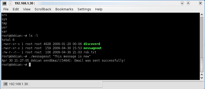 More coolness can be had by sending messages to multiple email/cell phone addresses using the -cc option. All you have to do is add it into your command line using a space between each address. Here’s another example.# sendEmail -f This e-mail address is being protected from spambots. You need JavaScript enabled to view it -t This e-mail address is being protected from spambots. You need JavaScript enabled to view it -cc This e-mail address is being protected from spambots. You need JavaScript enabled to view it This e-mail address is being protected from spambots. You need JavaScript enabled to view it -u “test message 2”
