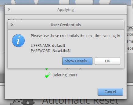 When the process completes, Resetter will display a new username and password for you to use, in order to log back into your newly reset distribution (Figure 6).