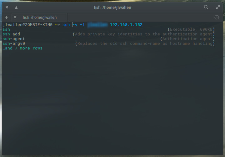 At this point, you’re ready to start using fish. The best way to do this is to start typing a command. You will see that fish does a great job of completing the command, bashed on your history. For example, if I start typing ssh, fish will complete the command with the most recent matching entry from bash history (Figure 2).
