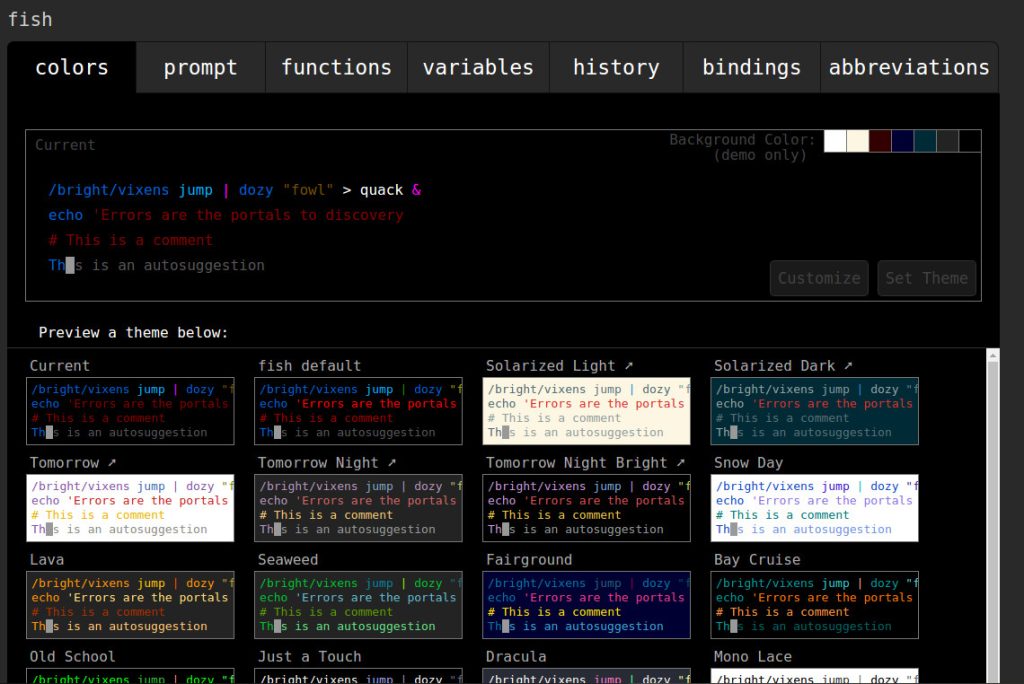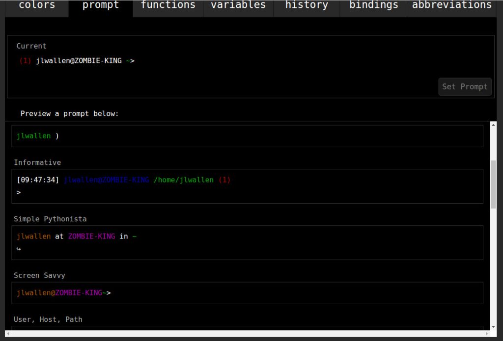 I highly recommend altering your fish prompt so that the differences between it and the standard prompt aren’t so subtle. To do this, click on the prompt tab, scroll down until you find a style that suits you, select that prompt, and then click the Set Prompt button (Figure 5).