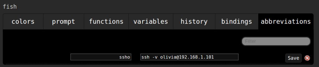 There are quite a lot of other options to be configured within the web-based tool. From here you can also set up abbreviations (aliases) for commands. This can also be done from the fish prompt, but using the web-based interface makes it a bit easier. Say, you regularly ssh to a particular server with the command: