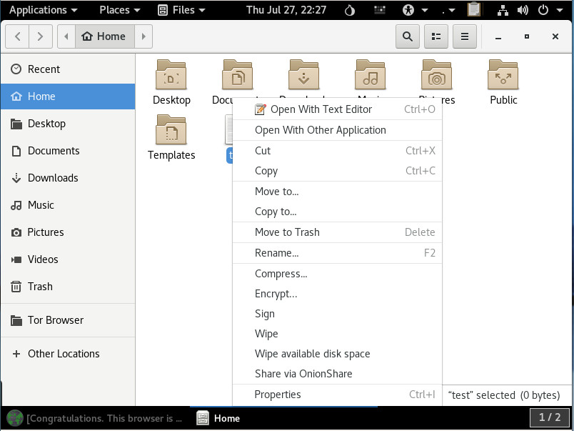 Figure 3: The GNOME Files right-click context menu, as seen through Tails.